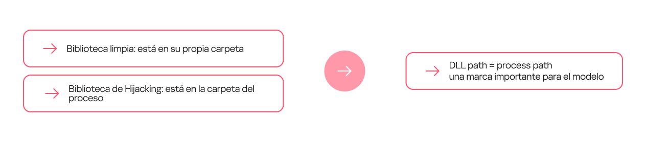 Para entender si podemos enseñarle a un modelo a distinguir la carga de una biblioteca maliciosa de una legítima, primero debemos definir un conjunto de características que con alta probabilidad indiquen que hay un DLL Hijacking. Destacamos los siguientes indicadores clave: