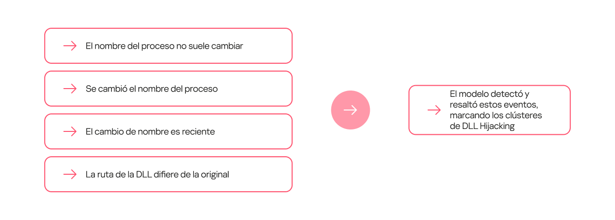 Otras dependencias pueden ser más complejas y requerir que se cumplan varias condiciones. Por ejemplo, el simple cambio de nombre de un proceso no indica por sí mismo un DLL Hijacking, pero si este nuevo nombre aparece por primera vez en el flujo de datos y la biblioteca se encuentra en una ruta no estándar, es muy probable que sea maliciosa.