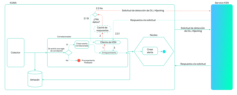 El trabajo del modelo, en términos generales, consiste en la verificación paso a paso de todas las bibliotecas DLL cargadas por los procesos en el sistema, con posterior validación en la nube de Kaspersky Security Network (KSN). Este enfoque permite combinar información sobre los atributos locales (ruta, nombre de proceso, hashes de archivos) con una base global de conocimiento e indicadores de comportamiento, lo que conduce a una mejora sustancial en la calidad de la detección y reduce la probabilidad de falsos positivos.