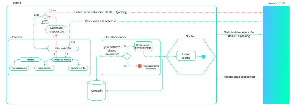 El modelo puede funcionar en uno de dos modos: el correlacionador o el colector. El correlacionador es un componente de SIEM que realiza el análisis y la correlación de eventos basándose en reglas o algoritmos predefinidos. Si la detección está configurada en el correlacionador, el modelo verifica los eventos en los que ya se ha activado alguna regla. Esto reduce el volumen de solicitudes que se envían a KSN y aumenta la velocidad de respuesta del modelo.