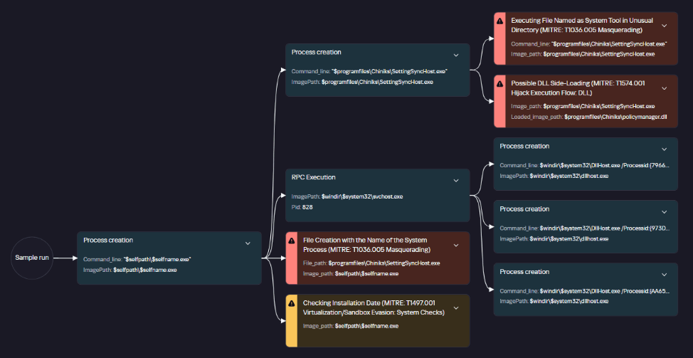Durante la fase piloto, verificamos la resistencia del modelo a las falsas alarmas y su capacidad para clasificar correctamente el comportamiento incluso en escenarios atípicos de carga de DLL. Como resultado, se identificaron varios incidentes reales en los que los atacantes utilizaron un tipo de DLL Hijacking (técnica DLL Sideloading), para obtener persistencia y ejecutar su código en el sistema.