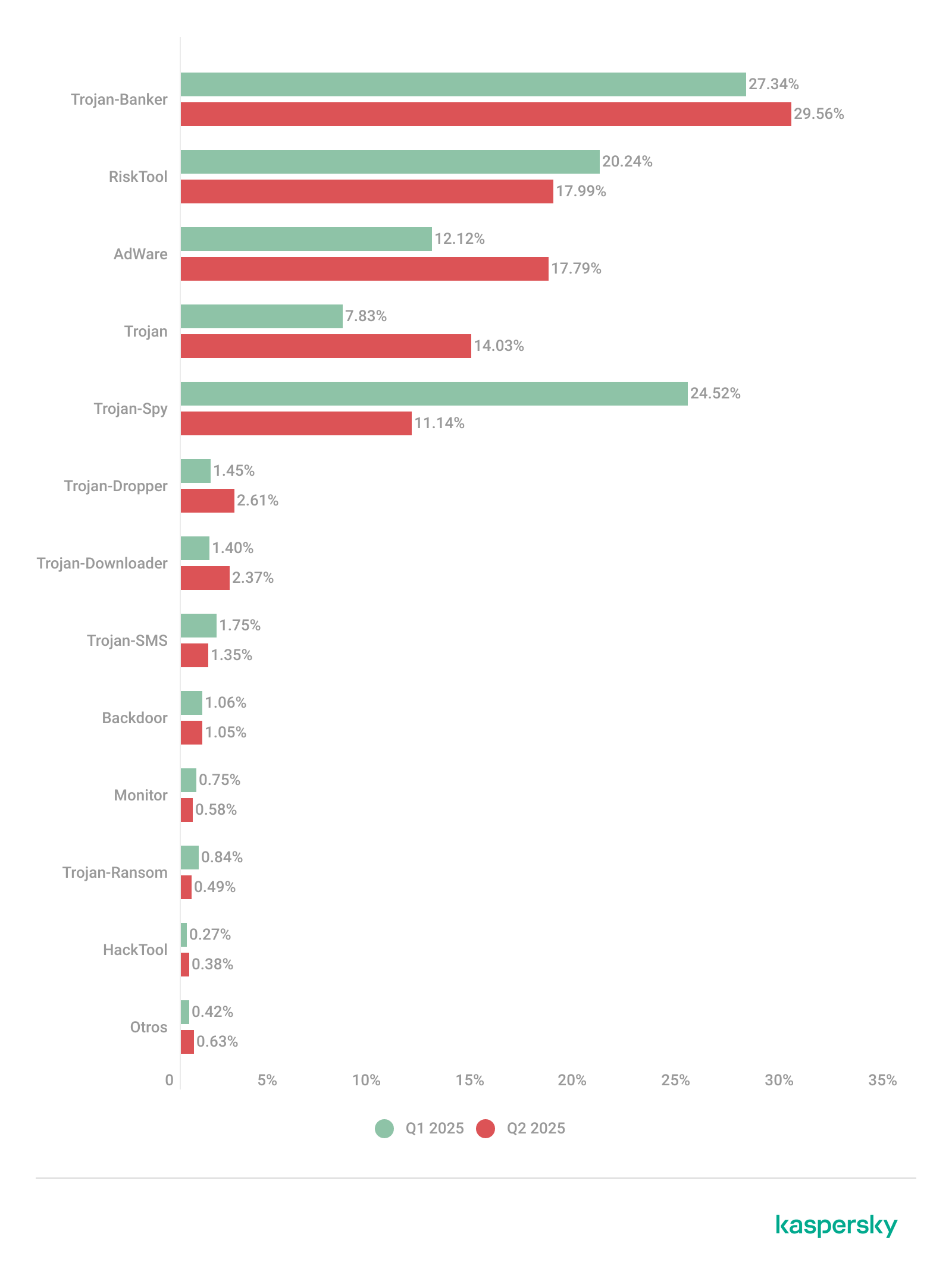 - La amenaza más común para los dispositivos fueron los troyanos, que atacaron a 31.69% de usuarios de los productos móviles de Kaspersky que sufrieron ataques.