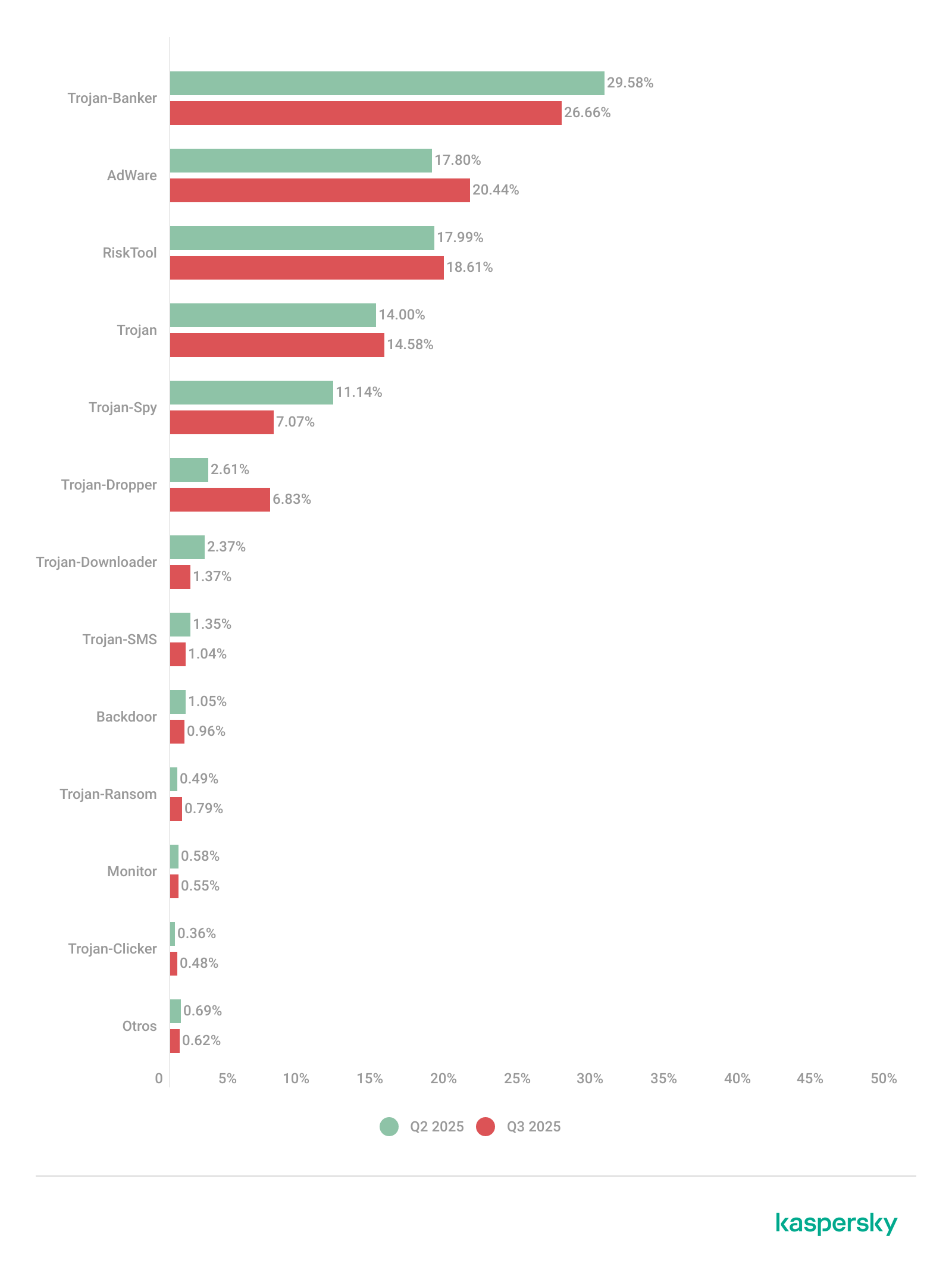 Proporción de usuarios atacados por un tipo específico de software malicioso o potencialmente no deseado, del total de usuarios de productos móviles de Kaspersky atacados, segundo y tercer trimestres de 2025 (descargar)