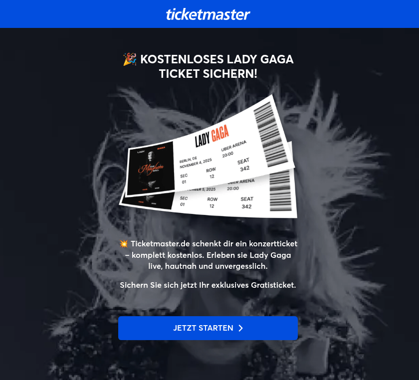 En 2025, uno de los temas más populares de los sitios de phishing en el sector de entretenimiento fueron los cines en línea, que ofrecían disfrutar de un estreno importante antes de su lanzamiento oficial. También fueron muy frecuentes las páginas de phishing que imitaban plataformas para la venta y entrega de boletos para eventos de entretenimiento. Los atacantes ofrecían a los usuarios boletos gratis para conciertos de artistas populares en una página con un diseño casi idéntico al sitio de una conocida boletería digital. Para participar en la “promoción” de los estafadores, la víctima debía pagar una pequeña comisión o los gastos de envío de los boletos a una dirección. Por supuesto, el usuario pagaba, pero no recibía ningún boleto.