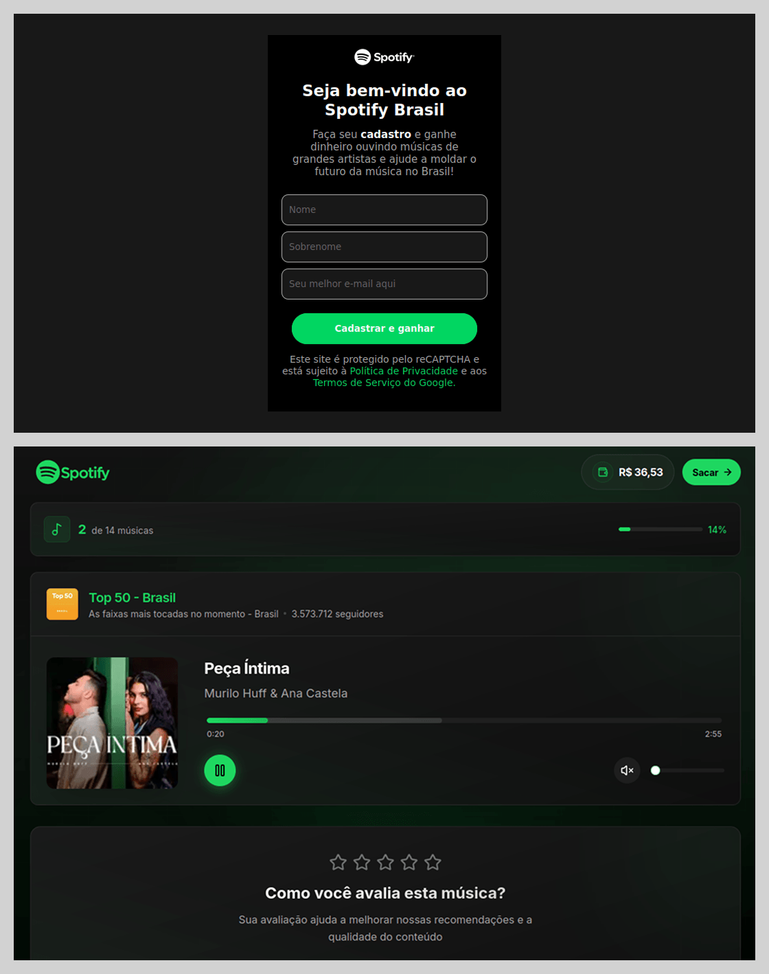 Los atacantes usaron la popularidad de Spotify no solo para phishing, sino también para ataques de scam. En Brasil, los estafadores ofrecían a los usuarios escuchar canciones, calificarlas y recibir dinero por ello.