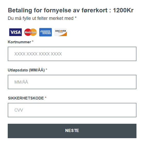 Detectamos un fraude dirigido a usuarios de Noruega que desean renovar su licencia de conducir. Al abrir el recurso, que imitaba el sitio oficial de la autoridad de transporte de Noruega, el visitante debía indicar el número del vehículo y un teléfono de contacto.