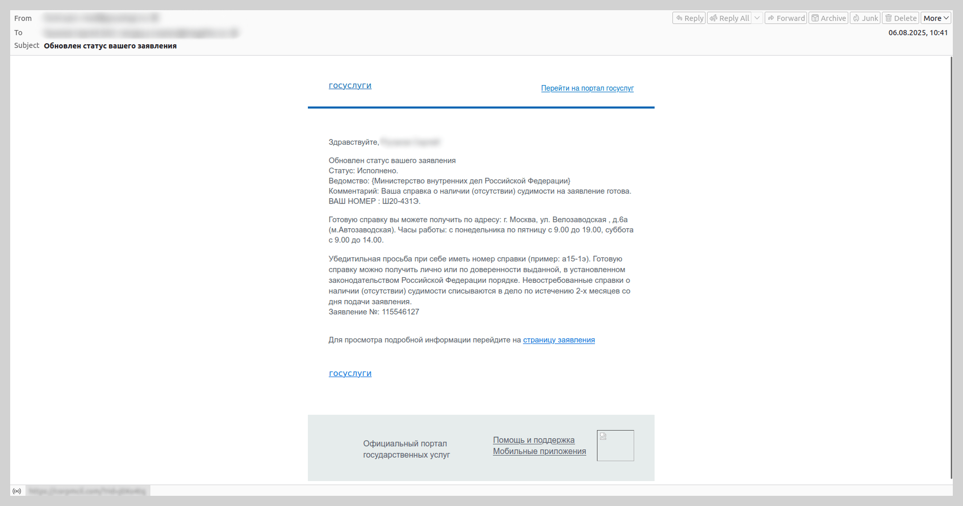 Observamos que desde la primavera de 2025 se hicieron más frecuentes los envíos de correos que se hacían pasar por comunicaciones automáticas del portal ruso de servicios gubernamentales. Estos mensajes se distribuían como notificaciones sobre la actualización del estado de una solicitud y contenían enlaces de phishing.