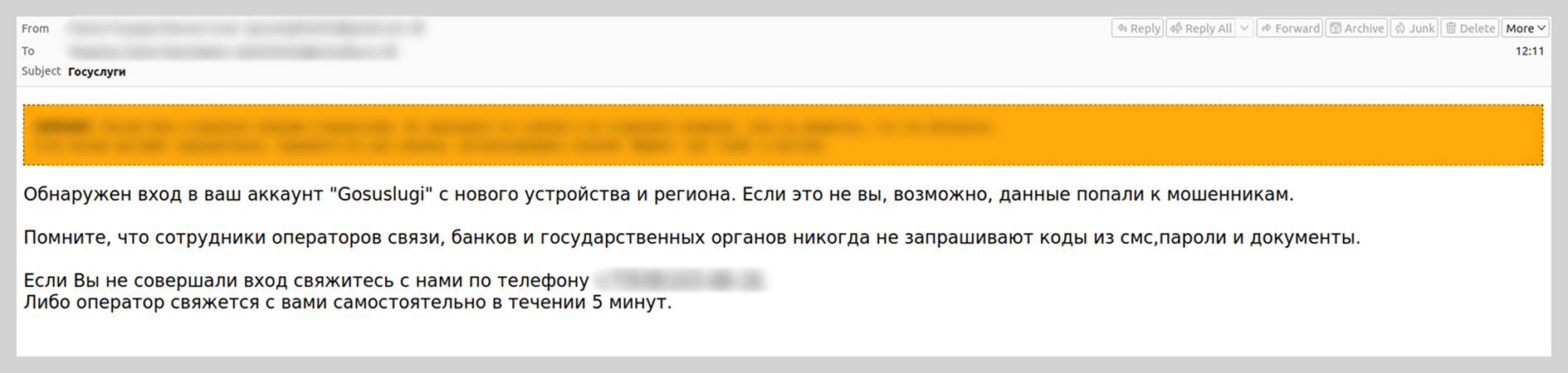 También registramos ataques de phishing dirigidos a usuarios de portales gubernamentales. En ellos, se le ofrecía a la víctima verificar la seguridad de su cuenta llamando al número indicado en el correo para contactar al la asistencia técnica. Para bajar la guardia de los usuarios, los atacantes añadían detalles técnicos falsos, como una dirección IP y la marca del dispositivo desde el que, según el mensaje, se había iniciado sesión, así como la hora del acceso.