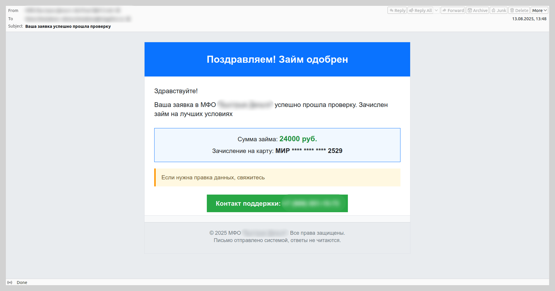 El año pasado, los atacantes también disfrazaron correos de phishing como notificaciones de MFO o BKI sobre solicitudes de préstamo. Si el destinatario no había solicitado el crédito (en eso se basaba el cálculo de los estafadores), se le proponía contactar a una asistencia técnica falsa mediante un número telefónico falso.