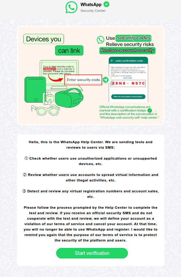 En China circulaban páginas de phishing que clonaban por completo la interfaz de WhatsApp. Los atacantes notificaban a la víctima que su cuenta había sido vinculada a actividades ilegales, y que debía pasar una “verificación adicional”.