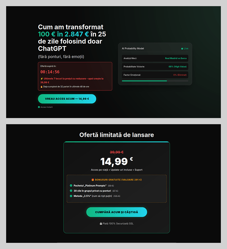 La promesa de ganancias fáciles con ayuda de redes neuronales se convirtió en otra forma de atraer la atención de posibles víctimas. Los estafadores proponían usar ChatGPT para hacer apuestas y prometían que el usuario recibiría ingresos y el bot haría todo el trabajo. Estos servicios se ofrecían a un precio que se mantenía vigente durante 15 minutos desde que se abría la página. Ese plazo tan breve no le daba tiempo a la víctima potencial para reflexionar y lo inducía a hacer la compra impulsiva.