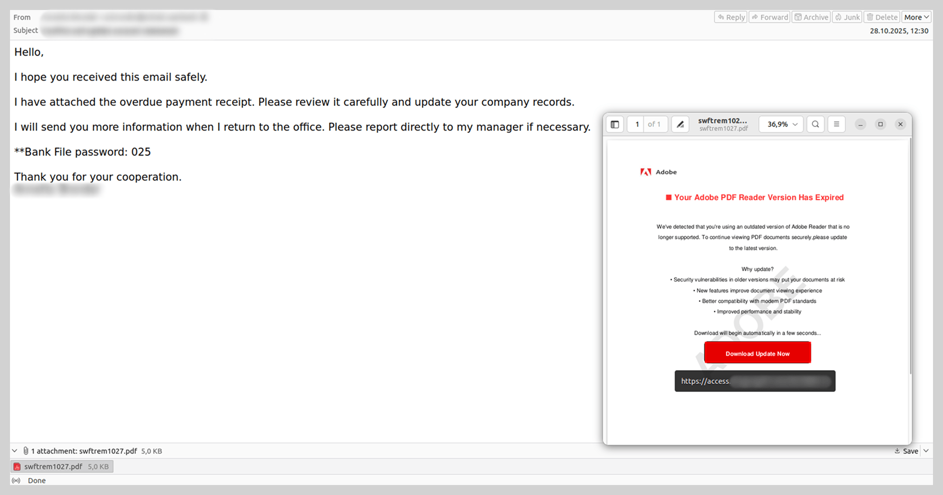 En estos correos, los atacantes, haciéndose pasar por especialistas de RRHH, pedían al empleado leer ciertos documentos, por ejemplo, una nueva política de la empresa o reglas de orden laboral interno. Los documentos estaban adjuntos al correo en formato PDF.
