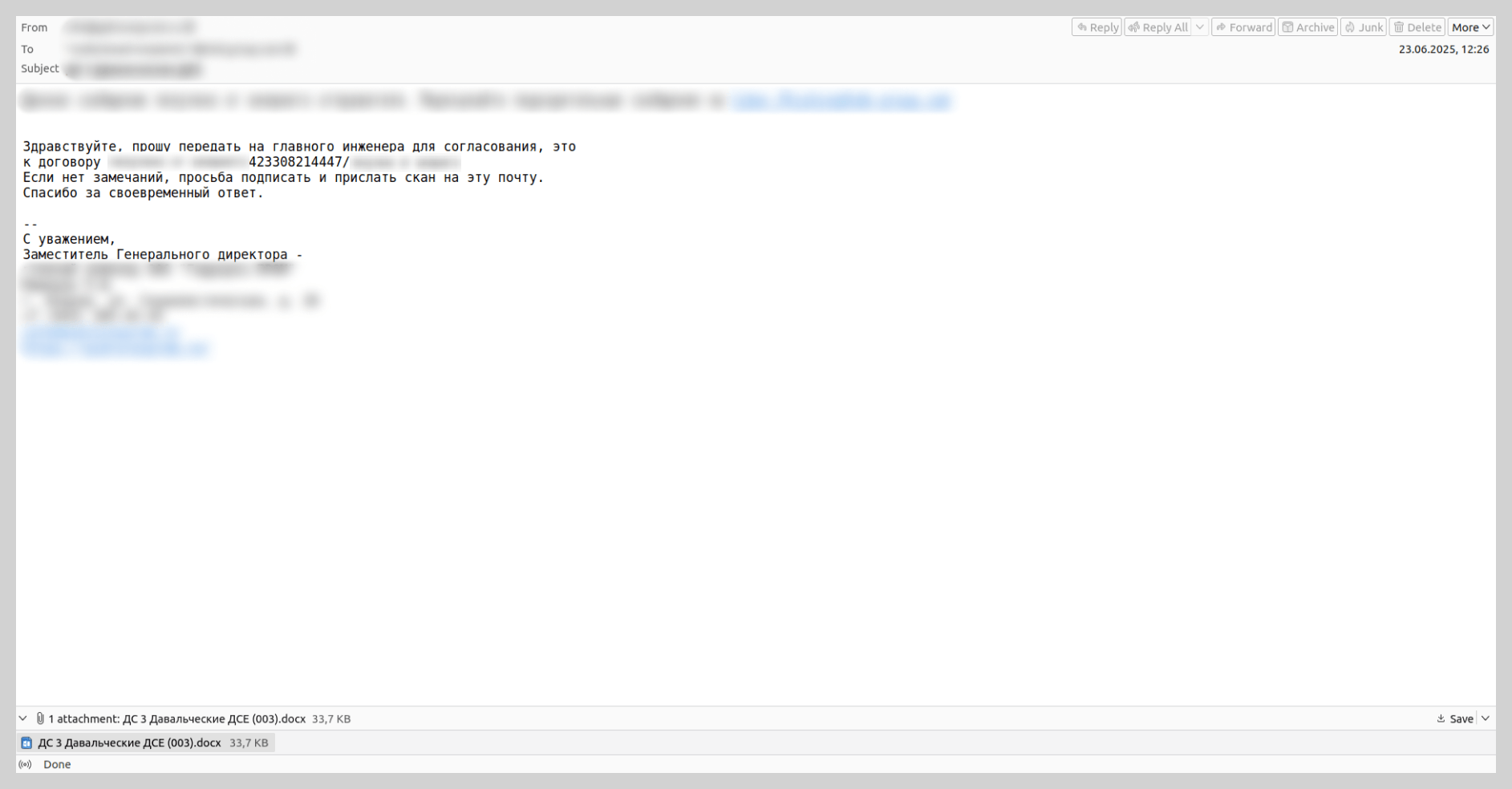 En 2025 se vieron con frecuencia mensajes que, con el pretexto de firmar un documento, obligaban a abrir un enlace de phishing o a abrir un adjunto malicioso. El esquema más común eran notificaciones falsas de servicios de firma electrónica de documentos. Se usaban con mayor frecuencia para ataques de phishing, aunque también es interesante un ejemplo malicioso de este esquema.