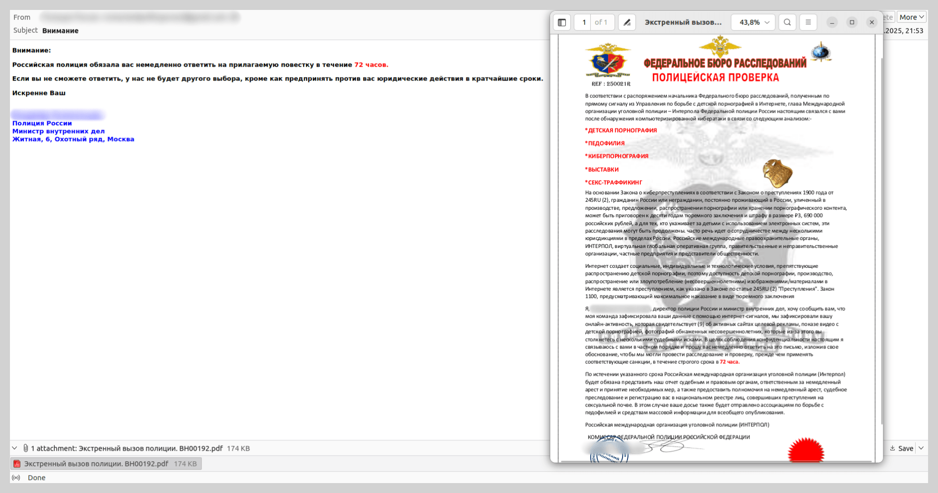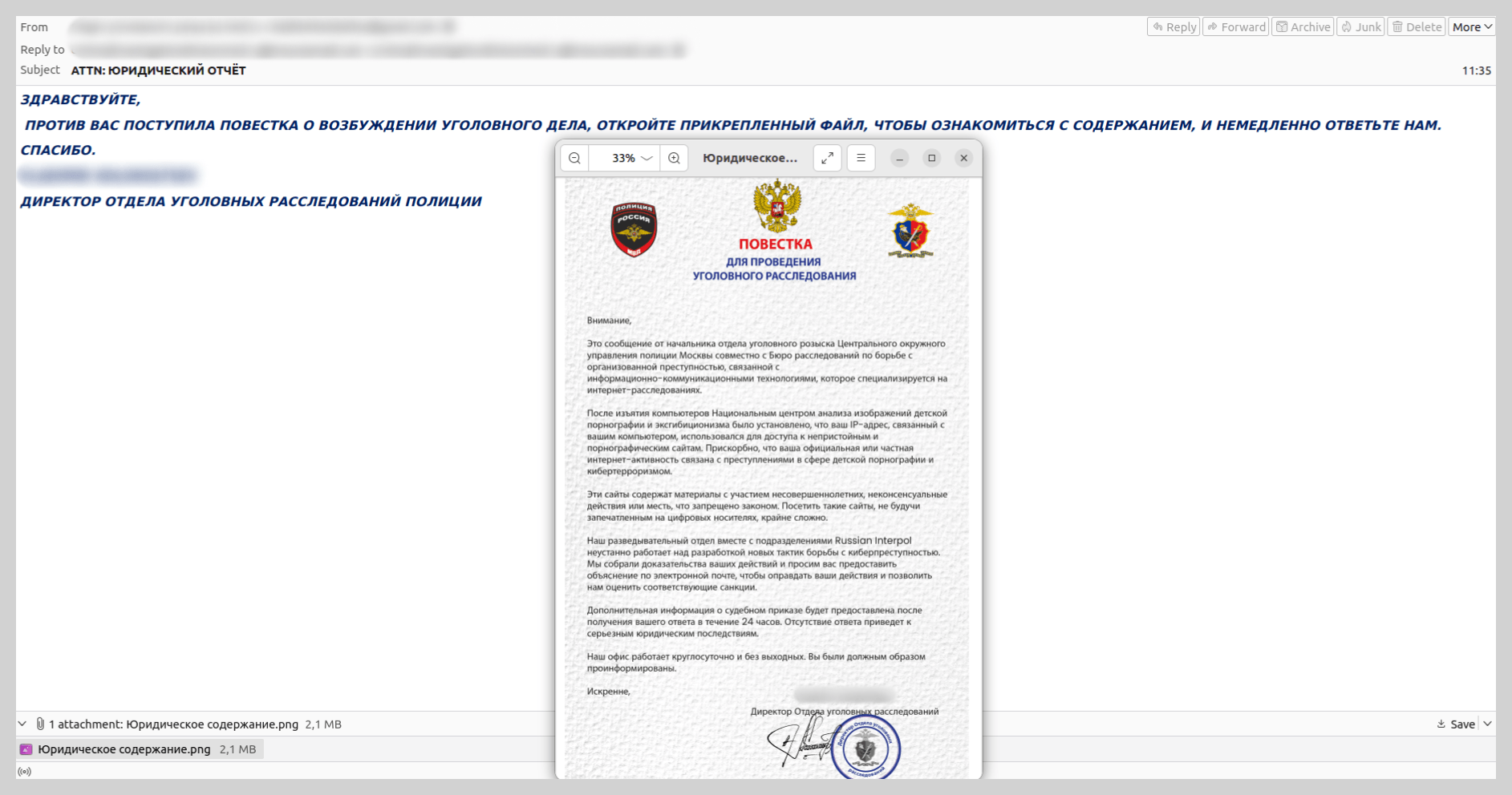 Por ejemplo, encontramos mensajes con notificaciones sobre la apertura de un caso penal, enviados supuestamente por la policía rusa. Sin embargo, las unidades policiales mencionadas en el correo nunca existieron en Rusia. El contenido de la citación también podía hacer que un usuario atento dudara de su legitimidad, ya que se acusaba al destinatario de cometer acciones ilegales, por ejemplo ver materiales prohibidos. Esta extorsión se basaba en inducir pánico en la víctima, para que no verificara lo escrito en la citación falsa.