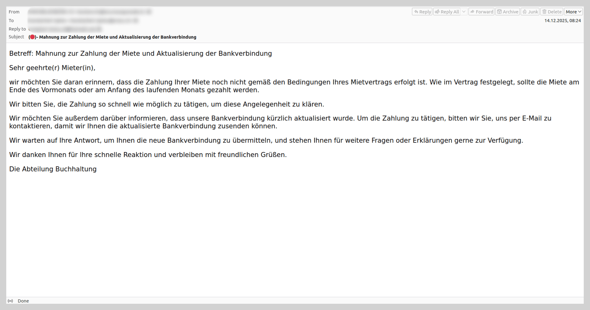 El año pasado detectamos un nuevo tema en los envíos masivos de scam, en el que el destinatario recibía una notificación sobre el vencimiento del plazo de pago del local rentado y se le exigía pagar la deuda lo antes posible. Para que la víctima no enviara fondos al arrendador real, el correo también informaba sobre un cambio de datos bancarios: el “deudor” debía solicitar los nuevos, que, por supuesto, pertenecían a los estafadores. Estos envíos apuntaban sobre todo a países francófonos, pero en diciembre de 2025 también detectamos un ejemplo de este scam en alemán.