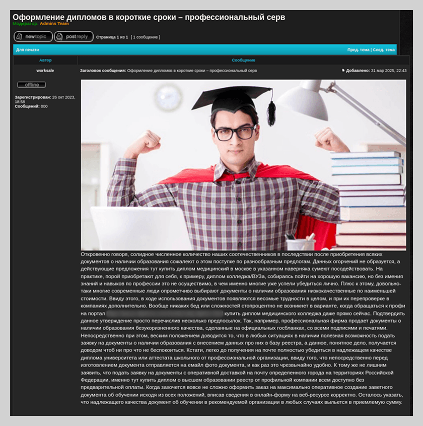 En primavera, antes del período de exámenes finales, detectamos mensajes sobre la venta de documentos educativos falsos. Los spammers insertaban anuncios fraudulentos como comentarios en foros antiguos sin moderación activa, aprovechando las notificaciones automáticas para alcanzar a todos los suscriptores del hilo. Estos mensajes o bien mostraban de inmediato el contenido del comentario con el enlace fraudulento, o bien avisaban de una nueva publicación, cuyos enlaces llevaban a sitios que vendían documentos falsos.