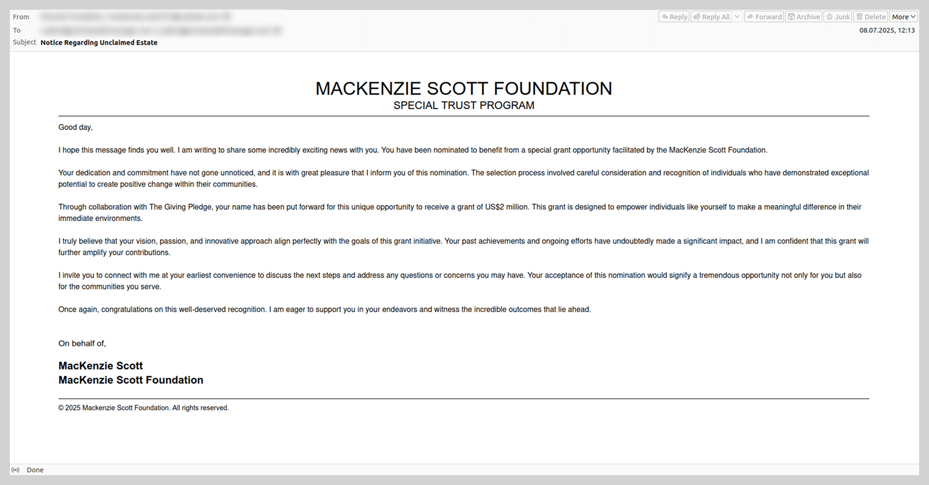 En verano, cuando uno de los temas más sonados fue la boda del fundador de Amazon Jeff Bezos, se empezó a enviar a los usuarios mensajes de estafas nigerianas, tanto en nombre del propio Bezos como en nombre de su ex esposa MacKenzie Scott. En estos correos se le prometía al destinatario una suma importante de dinero como donación o compensación por parte de Amazon.