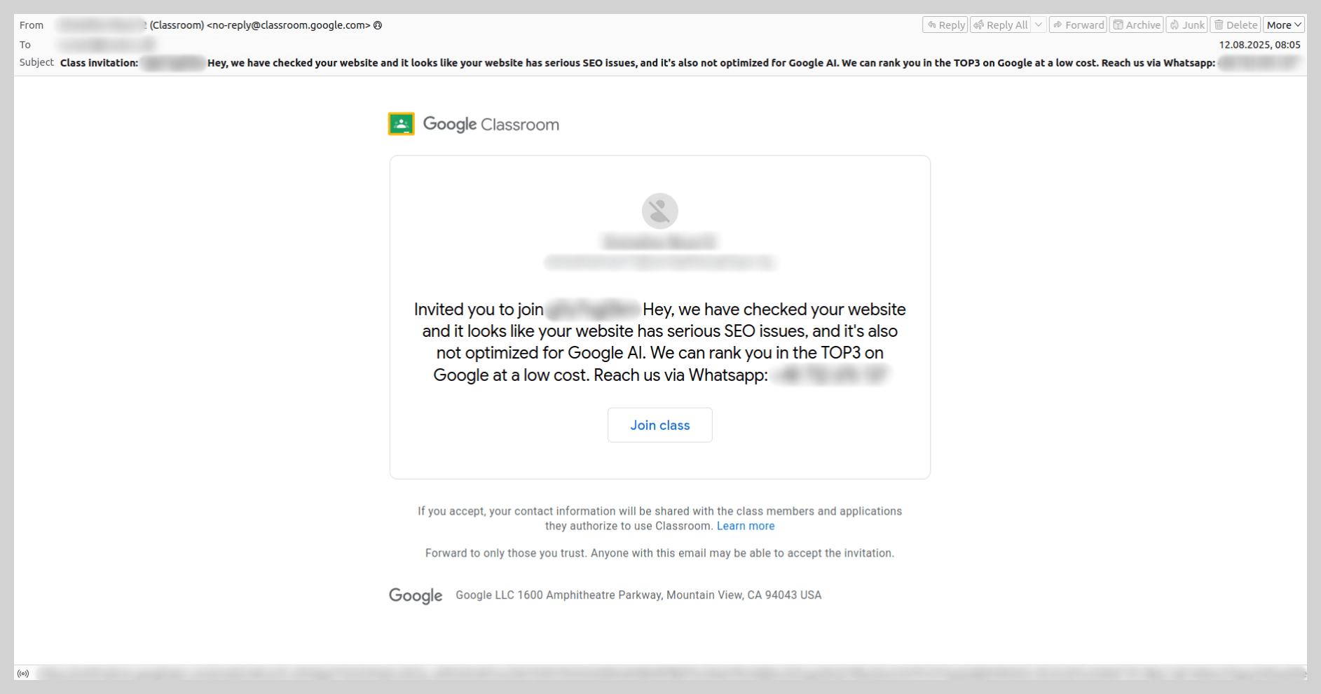 De la misma forma actuaban los spammers que usaban el servicio Google Classroom. Vimos ejemplos con ofertas de servicios de optimización SEO de sitios, donde se indicaba un número de WhatsApp para entrar en contacto.