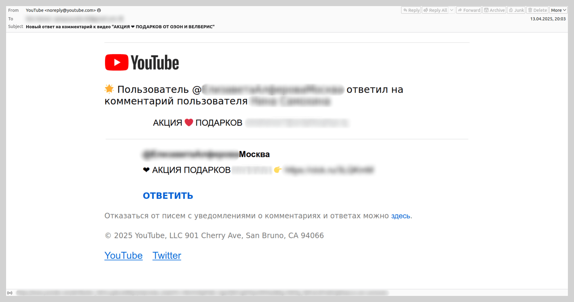 También registramos la distribución de enlaces fraudulentos mediante notificaciones legítimas de YouTube. Los atacantes respondían a comentarios de usuarios bajo varios videos, y como resultado la víctima recibía un correo sobre una nueva respuesta. En él se indicaba un enlace al video, que contenía solo un mensaje que invitaba a mirar la sección de descripción; ahí estaba el enlace al sitio fraudulento. El usuario recibía por correo el texto completo de ese comentario y podía seguir la cadena de enlaces, y al final llegaba a un recurso de scam.