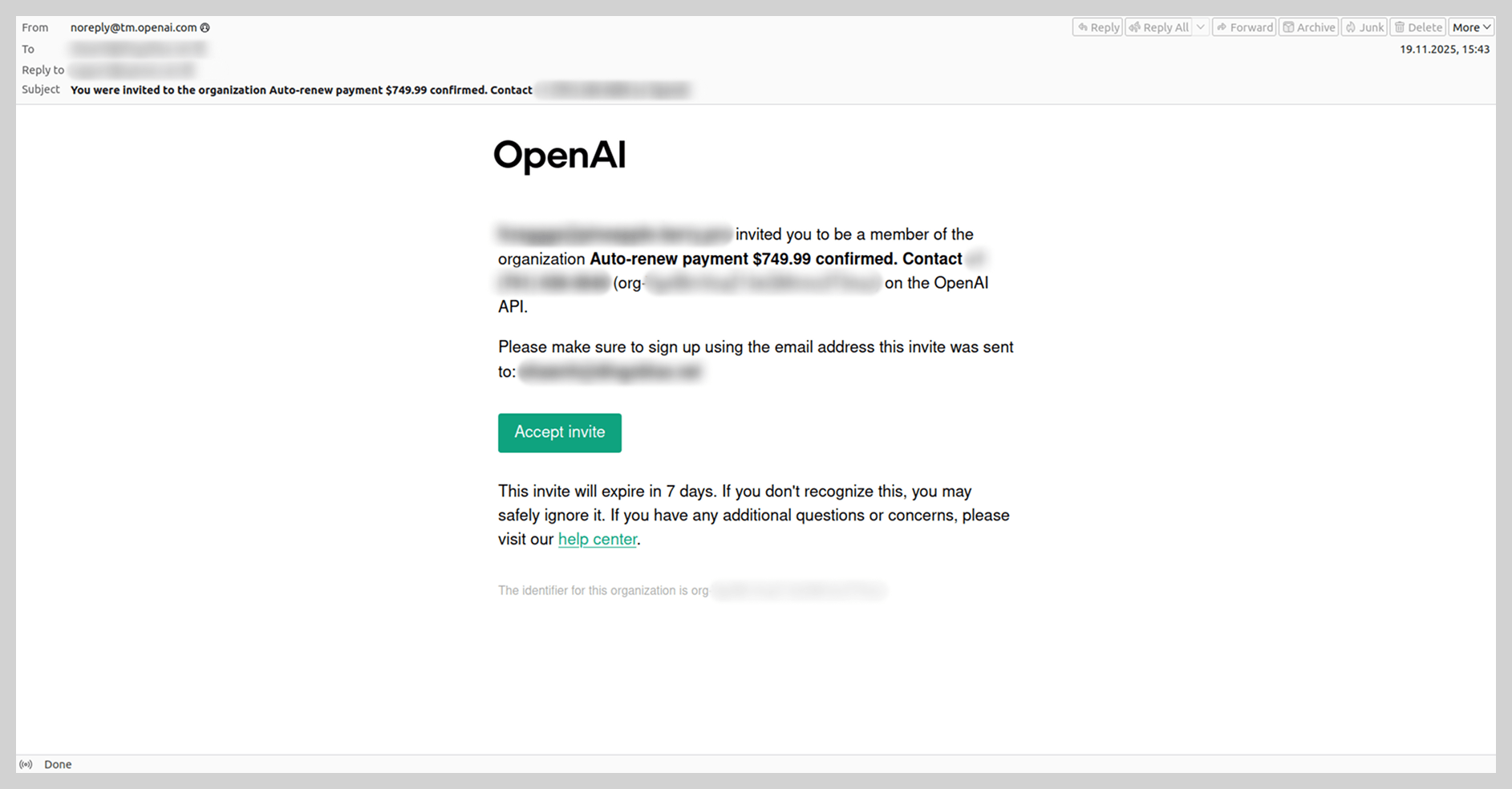 Además de los servicios de Google, los spammers usaron otras herramientas para enviar amenazas por correo, como la plataforma OpenAI, en un intento de aprovechar el auge de la inteligencia artificial. En 2025 vimos correos legítimos enviados por esta plataforma, donde los spammers añadían mensajes breves a sus víctimas, además de enlaces o números de teléfono fraudulentos.