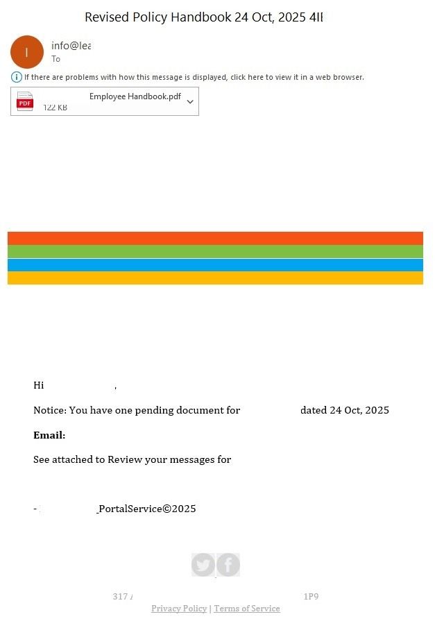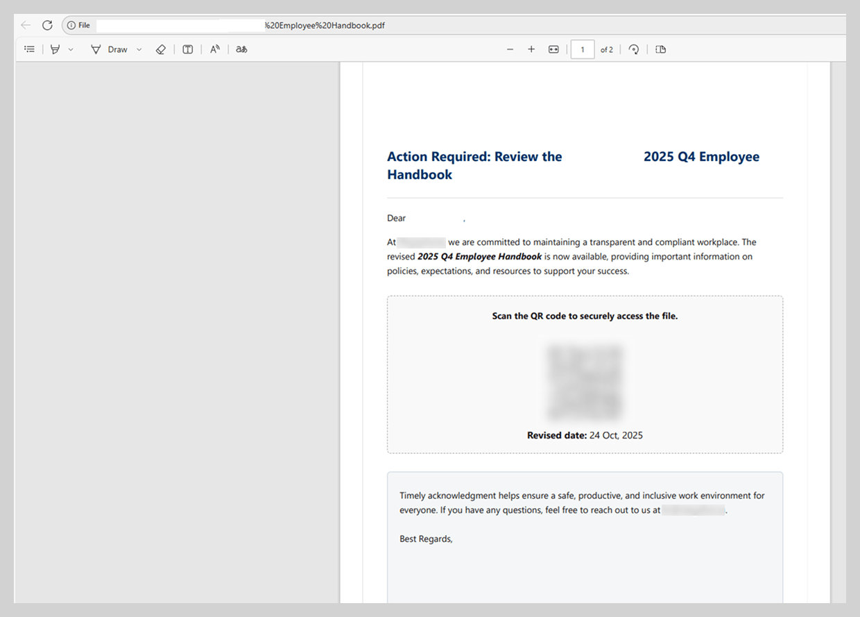 Mensaje de phishing con una nueva política de la empresaSiguiendo la historia, el documento PDF contenía un llamado bastante convincente para escanear un código QR y obtener acceso al archivo. Anteriormente, los códigos QR aparecían en el cuerpo del mensaje; en 2025 los atacantes priorizaron su inclusión en adjuntos PDF, probablemente para evadir filtros de correo.