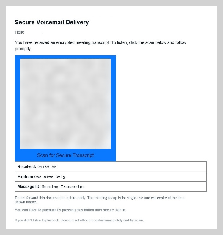En el ejemplo descrito, el adjunto era una notificación de un nuevo mensaje de voz. Para escucharlo, el usuario debía escanear el código QR e iniciar sesión en su cuenta en la página que aparecía.
