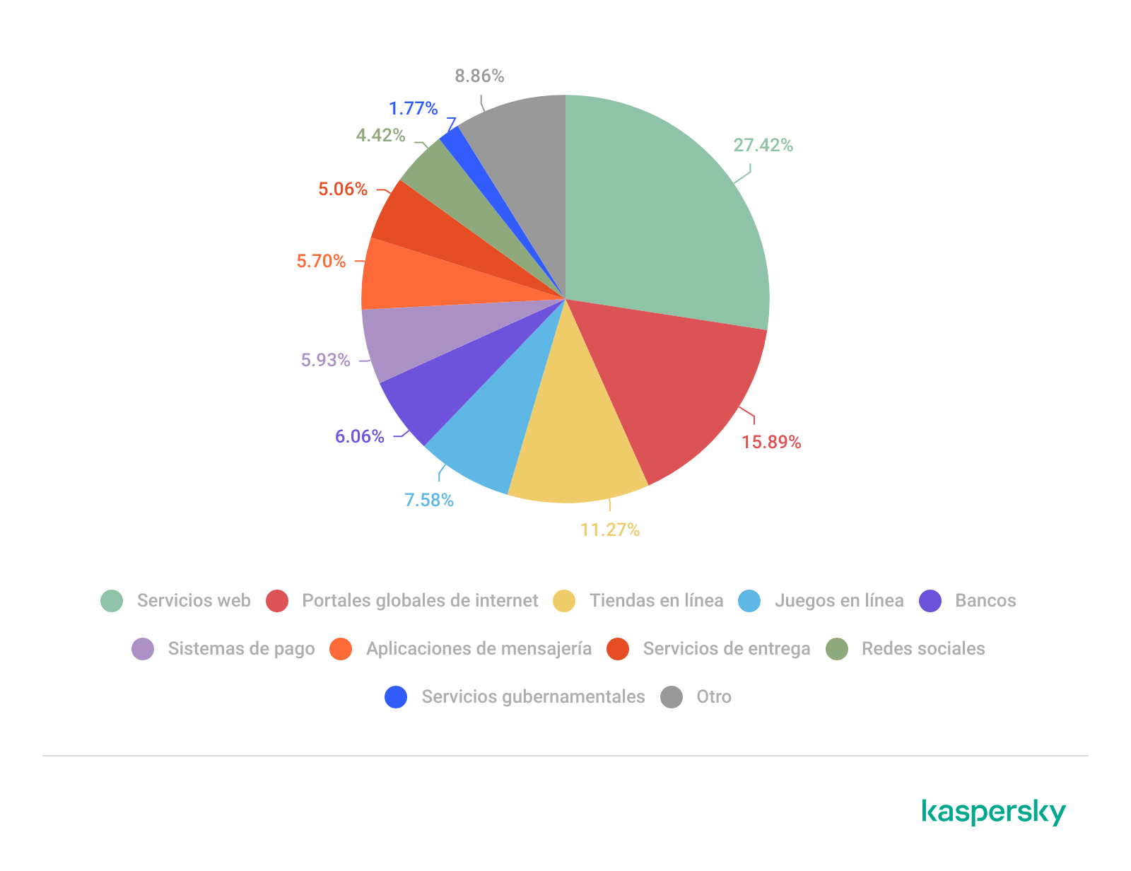 Las páginas de phishing que fingía ser servicios web (27,42%) y portales globales de Internet (15,89%) mantuvieron sus posiciones dominantes en el TOP 10, ocupando el primer y segundo lugar respectivamente. Las tiendas en línea, que son un objetivo habitual de los atacantes, volvieron al tercer lugar con un 11,27%. En 2025, creció el interés de los phishers por usuarios de juegos en línea: sitios que fingen ser de juegos subieron del noveno al quinto lugar del ranking (7,58%). Les siguen los bancos (6,06%), los sistemas de pago (5,93%), los mensajeros (5,70%) y los servicios de entrega a domicilio (5,06%). También se dirigieron ataques de phishing a cuentas en redes sociales (4,42%) y en servicios gubernamentales (1,77%).