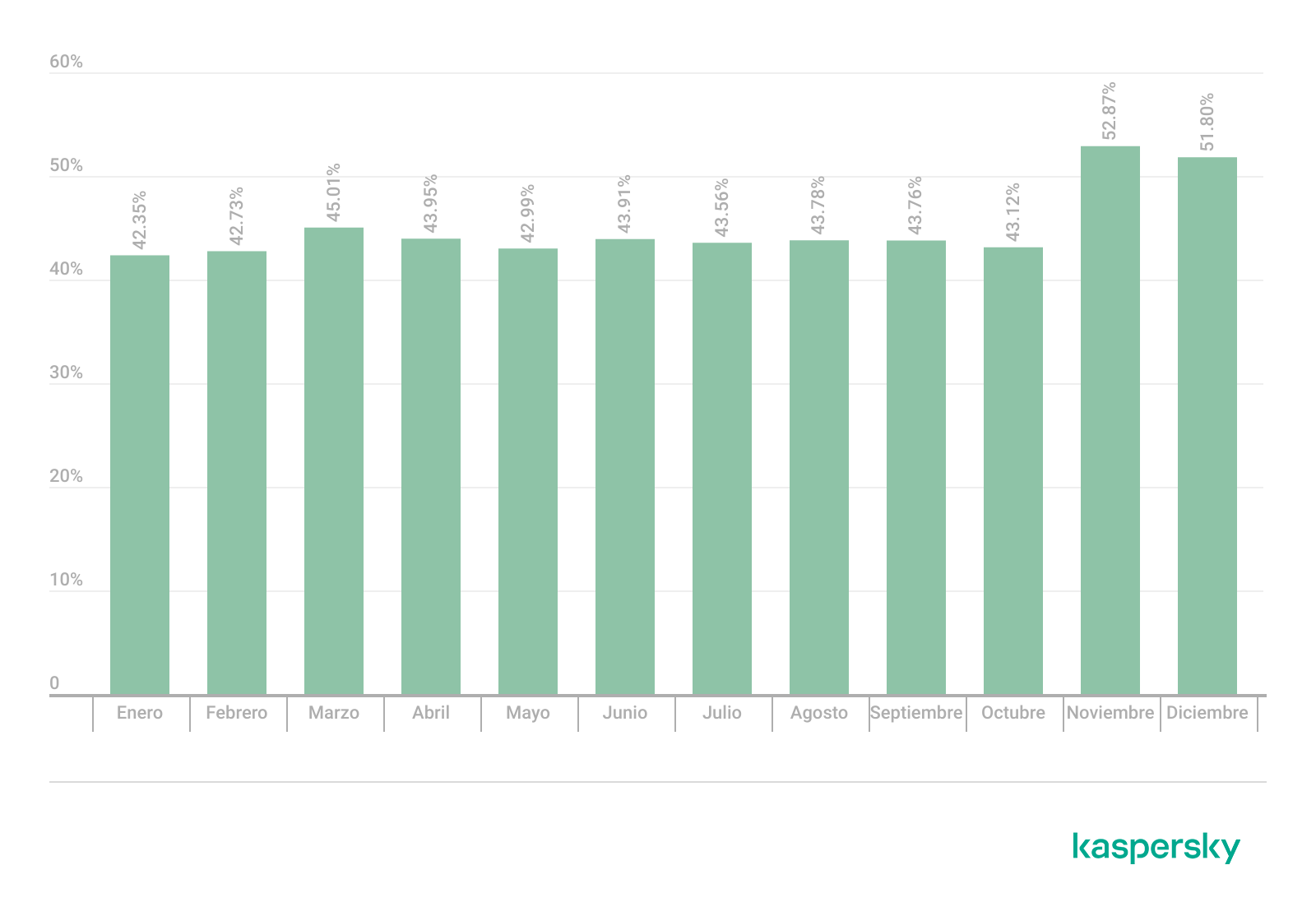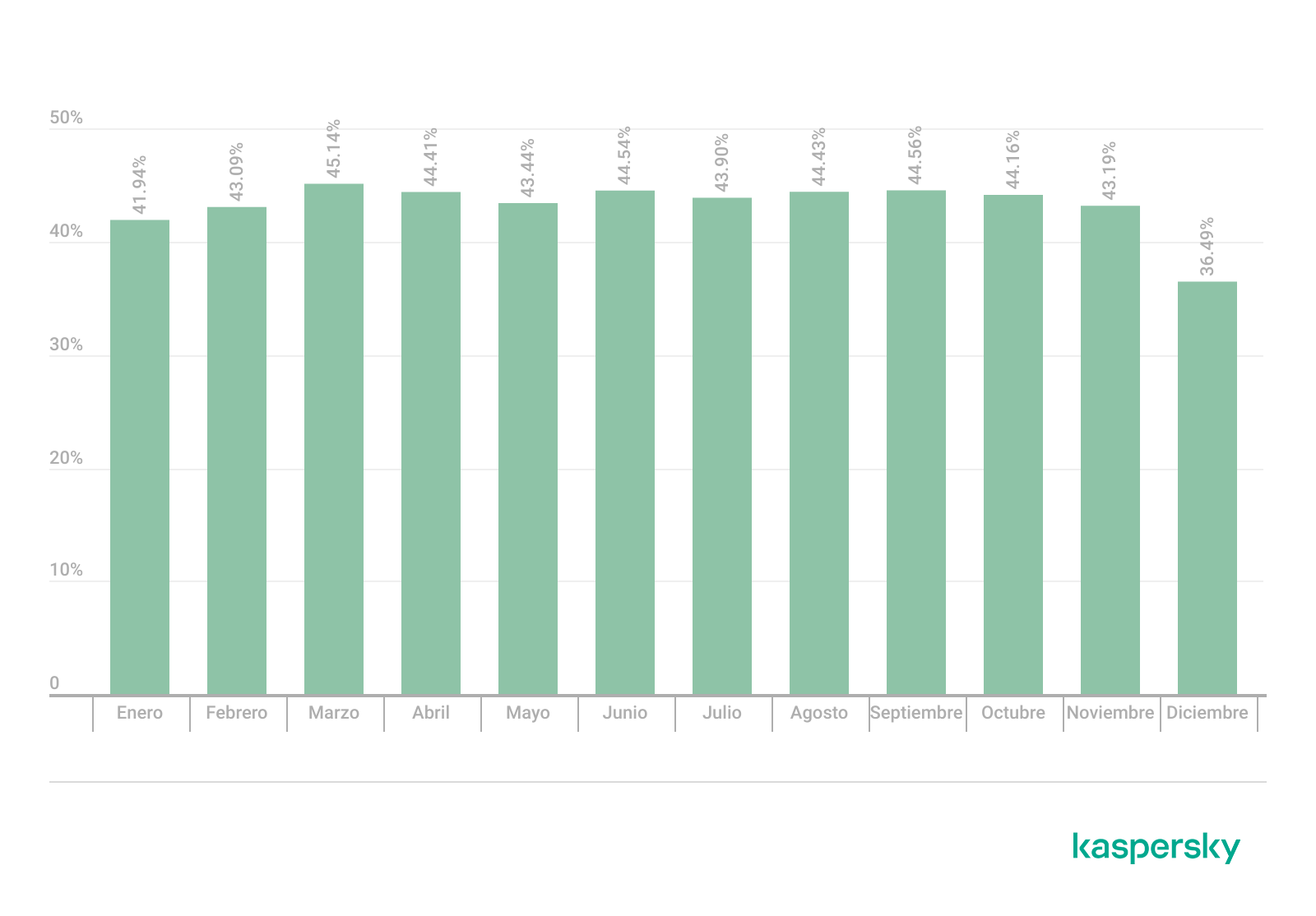 En el segmento ruso de Internet observamos una caída mayor: el promedio de spam bajó 5,3 p. p. y quedó en 43,27%. A diferencia de la tendencia mundial, el cuarto trimestre fue el más tranquilo con 41,28%. La menor actividad de spam se registró en diciembre: ese mes solo 36,49% de los correos fueron basura. Enero y febrero también fueron más tranquilos, con promedios respectivos del 41,94% y 43,09%. En cambio, los indicadores de marzo a octubre en el Runet se alinearon con los globales: en esos meses no hubo picos de actividad, y en promedio los correos spam representaron el 44,3% del tráfico total.