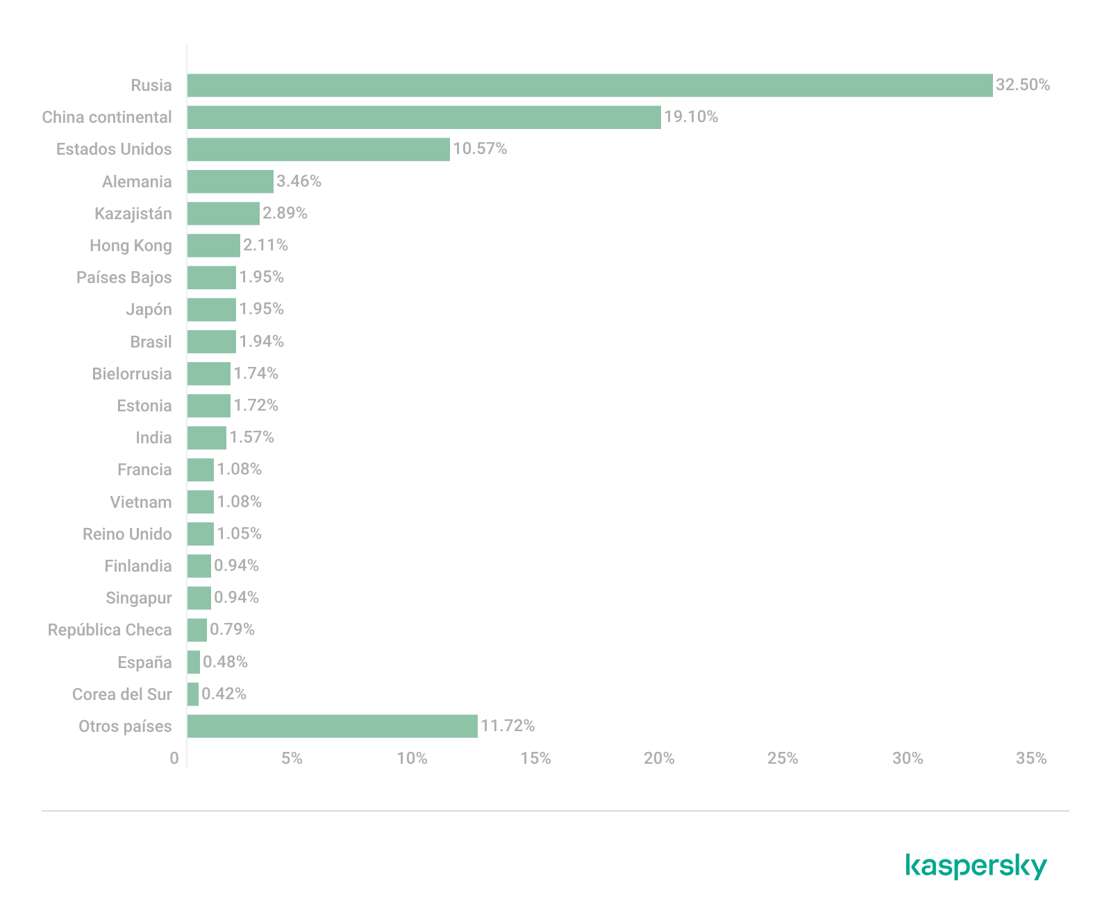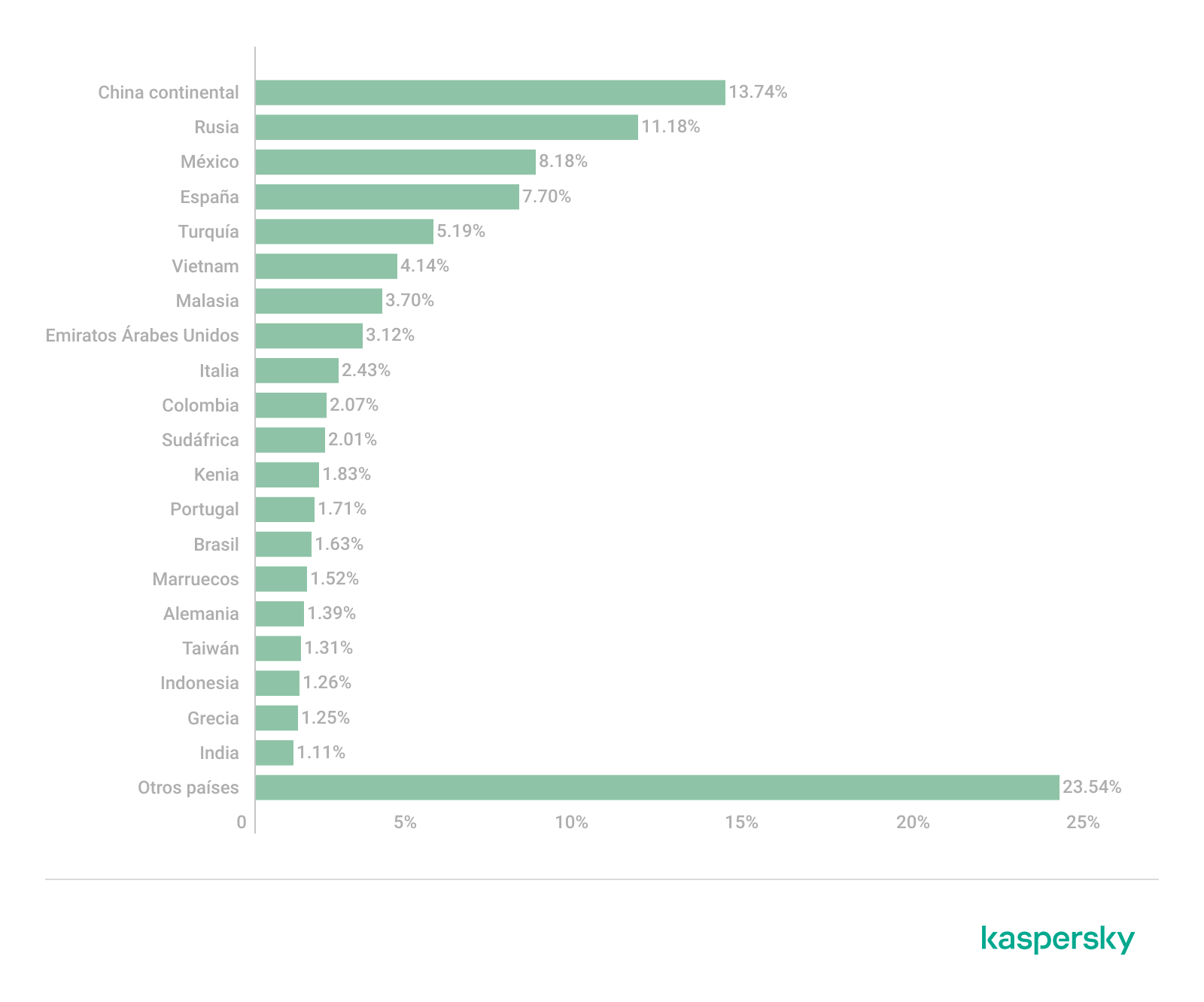 El mayor número de adjuntos de correo maliciosos se bloqueó en dispositivos de usuarios de China: 13,74%. Rusia, por primera vez en dos años, bajó al segundo lugar con un 11,18%. Luego, con una diferencia pequeña entre sí, siguen México (8,18%) y España (7,70%), que intercambiaron posiciones en comparación con el año anterior. El número de detecciones del antivirus de correo subió de forma leve en Turquía (5,19%); el país se mantuvo en el quinto lugar. El sexto y séptimo lugar los ocupan Vietnam (4,14%) y Malasia (3,70%); ambos subieron en el TOP gracias al aumento de su proporción de detecciones. Les siguen los EAU (3,12%), sin cambios de posición. También entraron en el TOP 10 Italia (2,43%) y Colombia (2,07%).