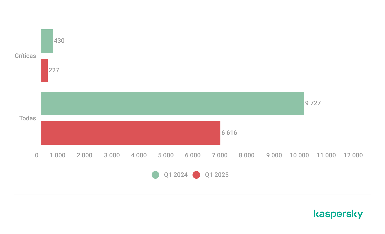 Número total de vulnerabilidades registradas y número de vulnerabilidades críticas, primer trimestre de 2024 y primer trimestre de 2025 (descargar)